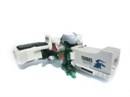 Tauros is green with a silver helm that has an indented curve. There are red designs on the arm and on the feet. Its shoulder pads are flatly spiked with red and black designs on it. In its core is a set of Round Hold Parts, meant to compress fired B-Dama into straight paths for accurate shots.