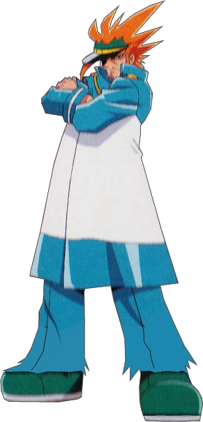 Daizou is a tall man with an imposing stature. He has orange hair, orange eyes and a stubble. He wears a ship captain's hat in his head, the teal blue and white outfit of the Dark Lizards and teal blue pants.