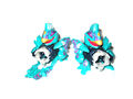 Jaku's Head Part has a fin on top of it like a peacock's plumage, along with purple eye designs, a circle in the forehead, and a red visor in an open beak.