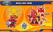 Takara-Tomy's original Zero Series included this B-Daman as the Armor-only Rekkouryuu Armor kit, while the Hasbro Battle B-Daman Toy Line offered both the Rekuso standard full B-Daman kit as well as the Rekuso DHB set with exclusive deco-matched DHB Armor.