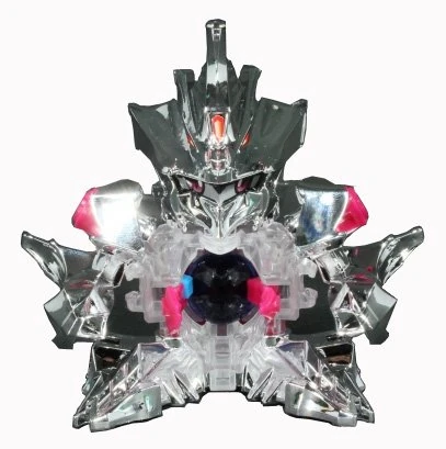 Spin=Dravise's Head Part is essentially a chrome silver recolour of Rev=Dravise's. With a dragon-inspired design, this Head Part appears as a dragon head wearing a helmet. The helmet extends left and right, carrying an upward slope as well. A horn sits atop the helmet, raised and curved in order to better handle one's grip to the B-Daman. Two spiked straps stick to the B-Daman's face, ending the helmet. Its dragon face offers anime-like violet eyes with a black pupil and white eye-lids. The impression of a chin is also left, slightly curved.